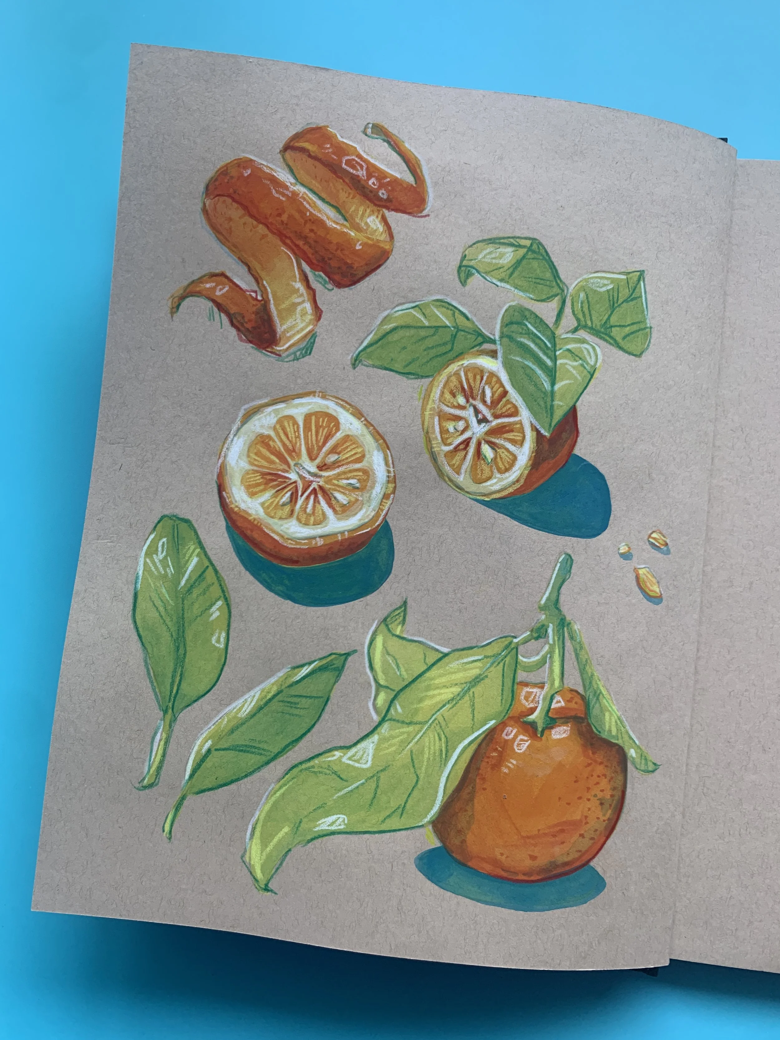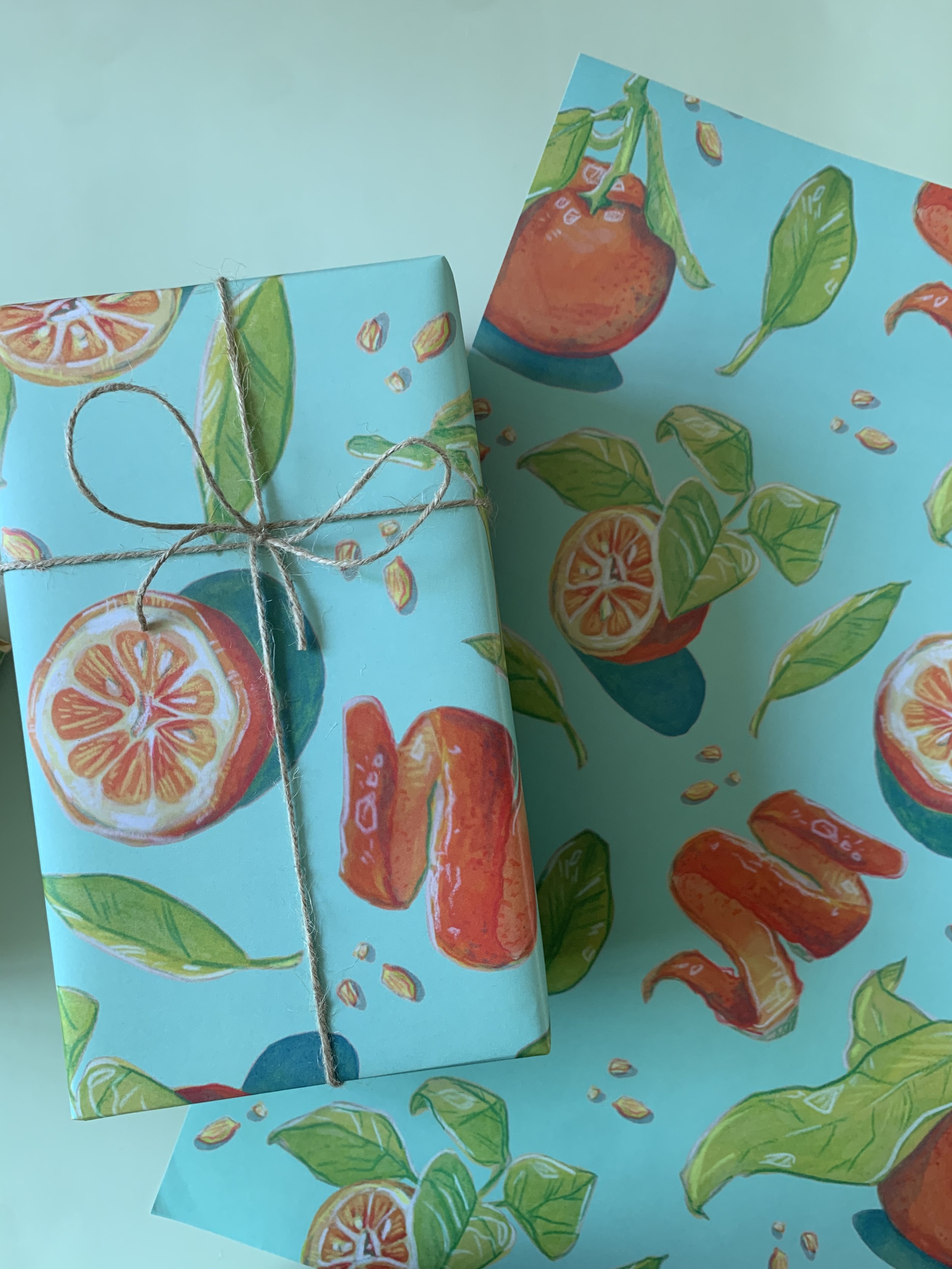the cute mandarin series was born as a continuation of my mixed media art study of citrus fruit. the illustrations were used to develop a sister product line to lemon zest, which included greeting cards, sticker sheets, and wrapping paper.